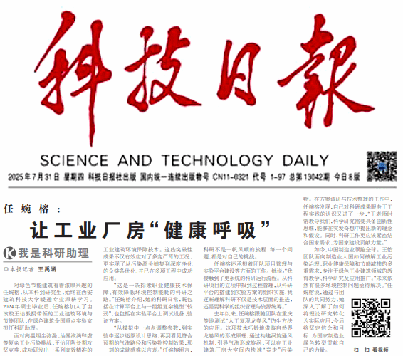 近日,《科技日报》刊发“我是科研助理”专栏报道,聚焦绿色建筑全国重点实验室科研助理任婉榕的科研日常与成长历程。报道介绍了任婉榕在硕士期间加入实验室常务副主任王怡教授团队,开展工业建筑环境与节能领域的相关研究。硕士毕业后,她留校加入绿色建筑全国重点实验室担任科研助理,投身科研和管理工作。