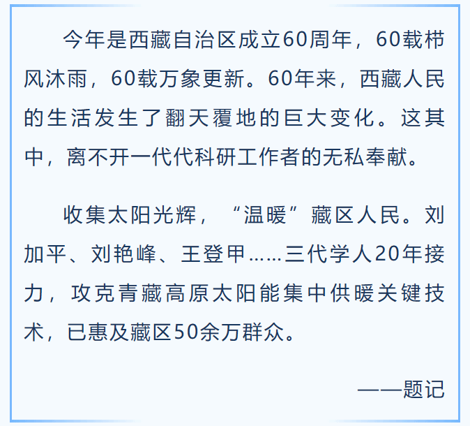 2019年,在刘加平院士、刘艳峰教授、王登甲教授三代学人的接续努力下,中国解决了青藏高原太阳能采集、储存、供暖的一系列技术难题,近零能耗太阳能供暖技术进入全面普及应用阶段。