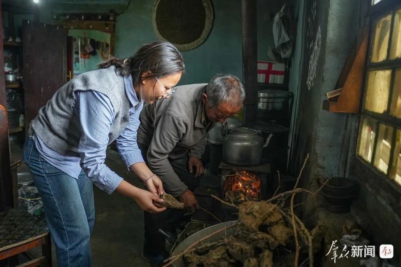 山南市曲松县下洛村,藏族姑娘次仁曲珍与爷爷用牛粪炉烧水。7月5日摄。